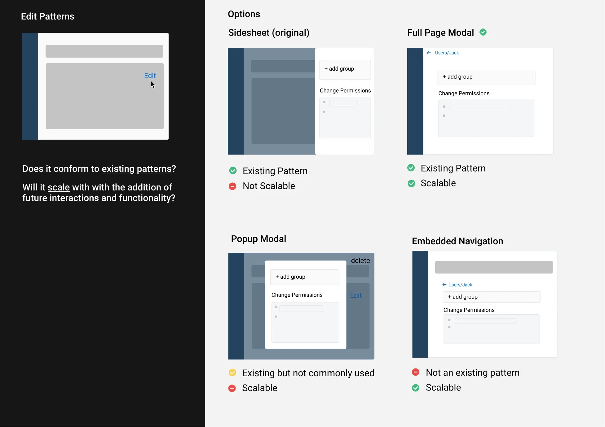 With the support of my design team, I made the decision to move towards a full-page edit experience — a pattern that exists with more serious editing experiences in other parts of the Segment app. This allowed for more more space to create a tabbed view for the management of permissions and user group membership and for the addition of a summary card.