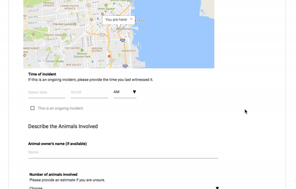 For this project, our team delivered a working prototype of the online form. While we were unable to develop a working prototype of the animal cop application, we handed off these designs for a contractor or future CMU HCI team to implement.
