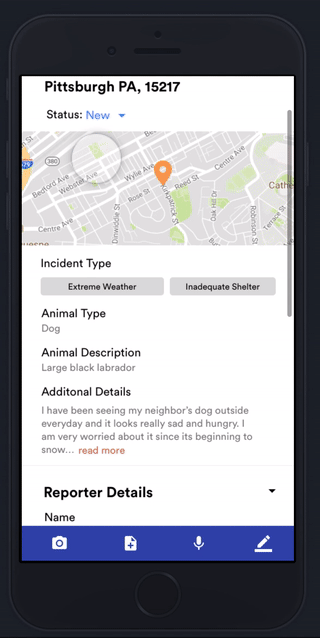 For the Humane Officer, we focused on management systems that would help humane officers organize, find, and view new reports. We focused on a mobile design for this part of the project after learning that most of the humane officers work happens on-the-go when en-route to visiting cases.