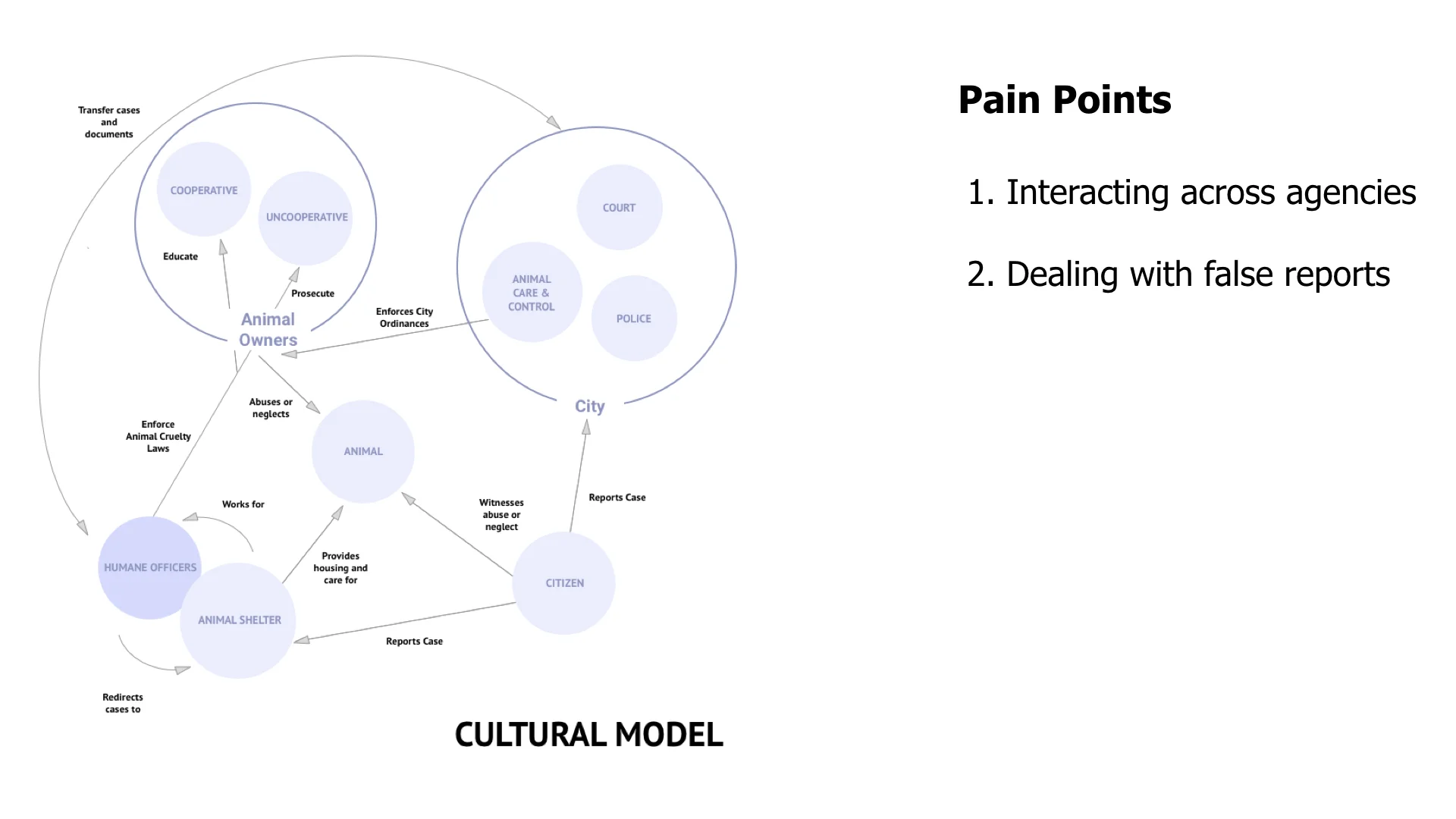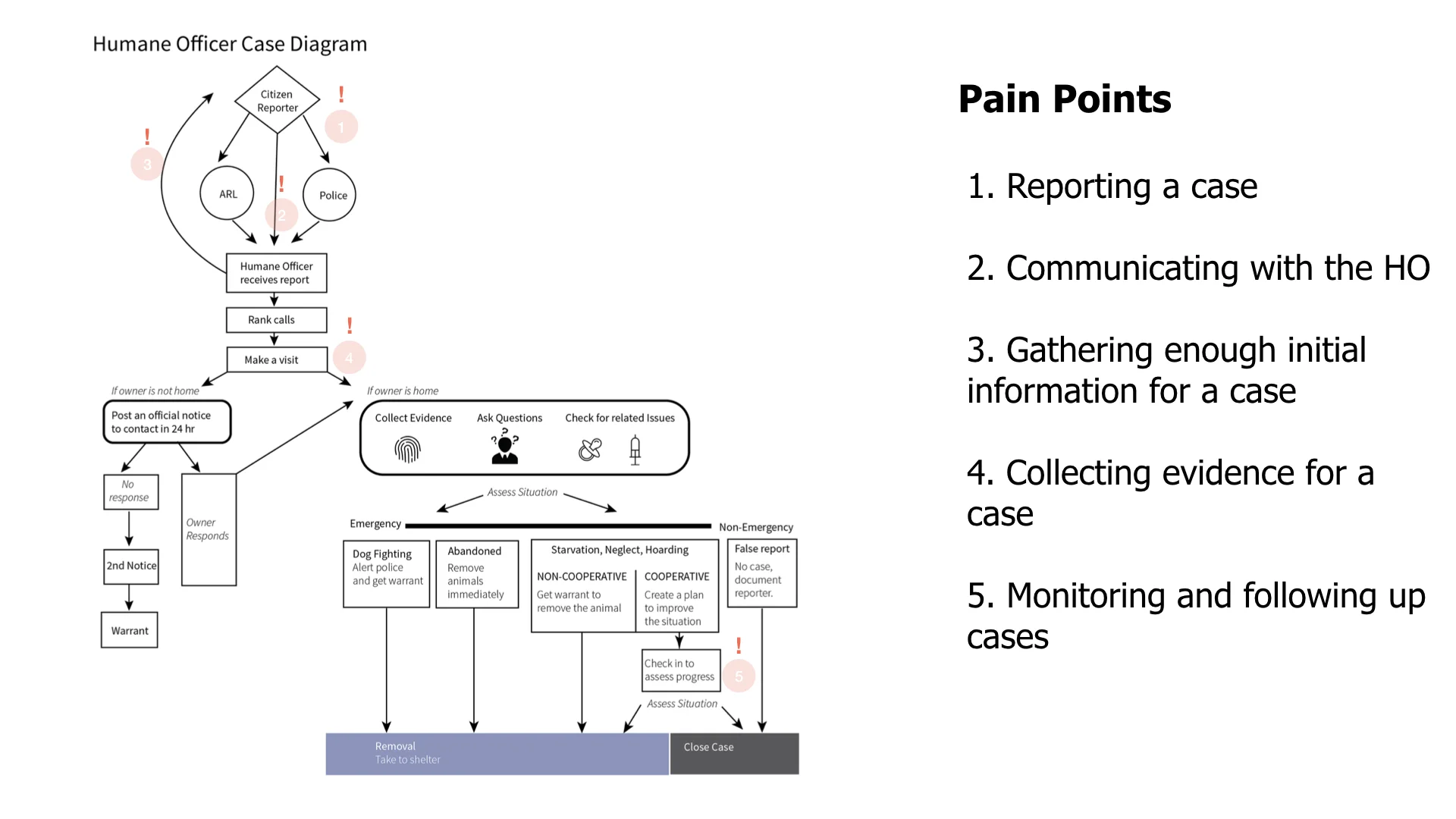 We found the opportunity to create a digital solution to address current pain points in the reporting-investigating process. Rather than burdening the animal shelter staff and humane officer staff with dealing with false reports and managing incoming cases, a digital platform could help facilitate citizen's reports and educate them through the process. At the same time, once these reports are sent, a digital platform focused on the humane officer needs could help them with managing their cases.