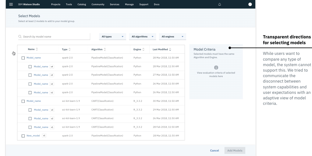 After removing a technical constraint and working with development, we were able to provide specific feedback to the user, explaining what criteria needed to be selected for models.