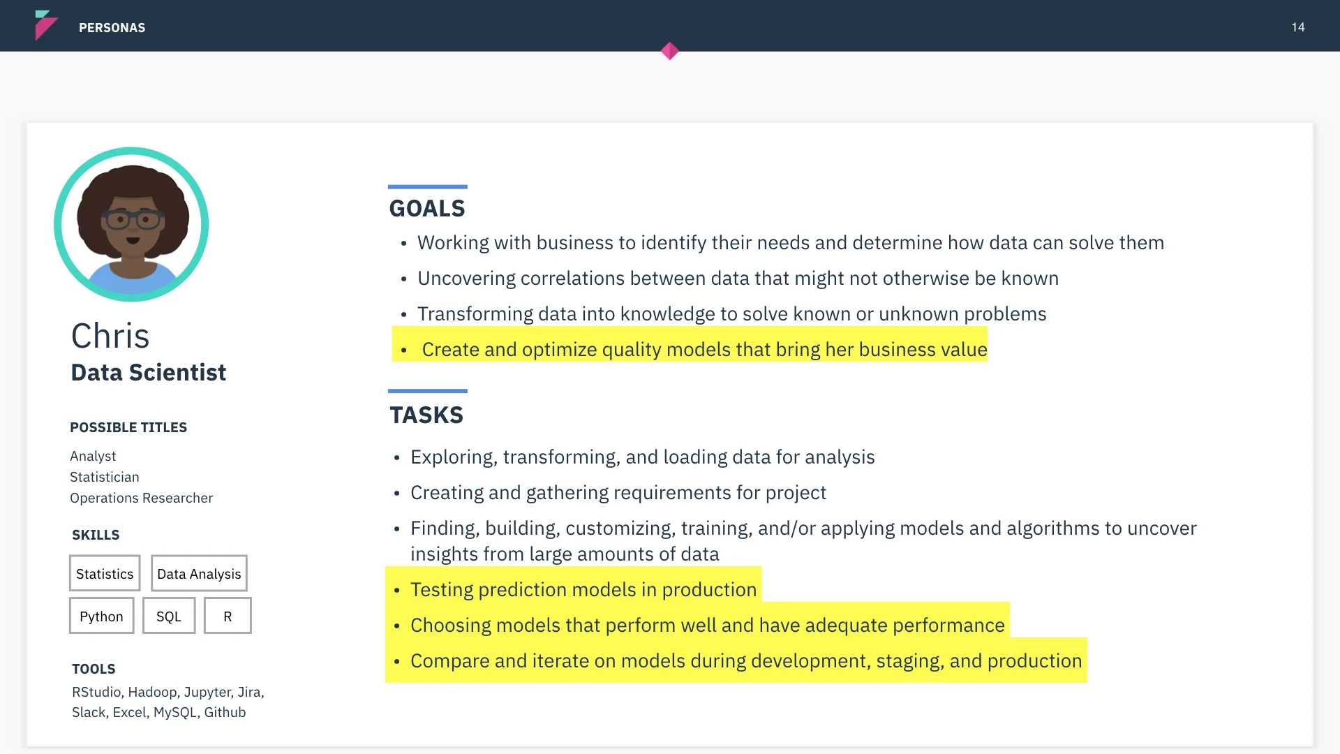 Our target persona is the Data Scientist. Part of their goals and tasks depend on optimizing and improving models for the business.